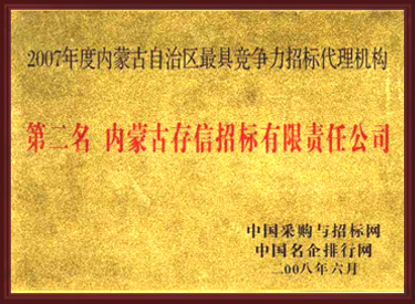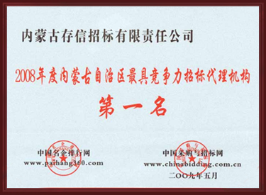 • 2008年度內(nèi)蒙古自治區(qū)最具競爭力招標代理機構(gòu)第一名